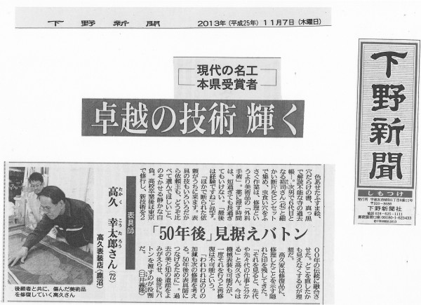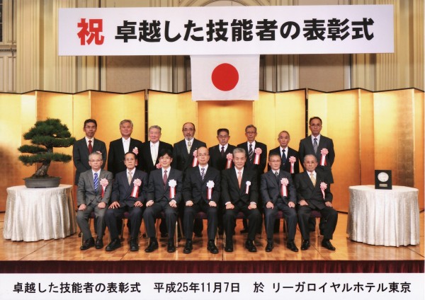 当店5代目社長の高久幸太郎が、厚生労働省の平成25年度卓越した技能者「現代の名工」を受賞いたしました!今年度全国では160人、栃木県内では5人選ばれたようです。11/7に東京にて表彰式に出席し、厚生労働大臣から表彰状、卓越技能章(盾と徽章)および褒賞金をいただきました。